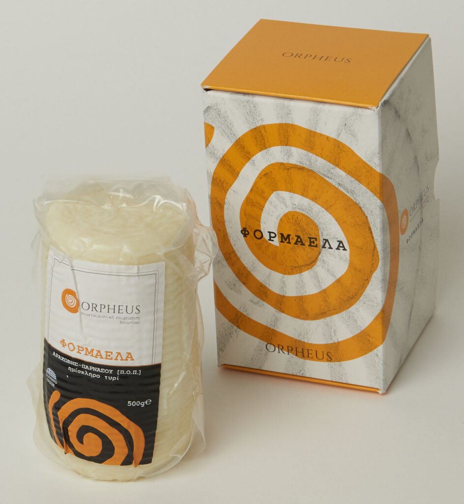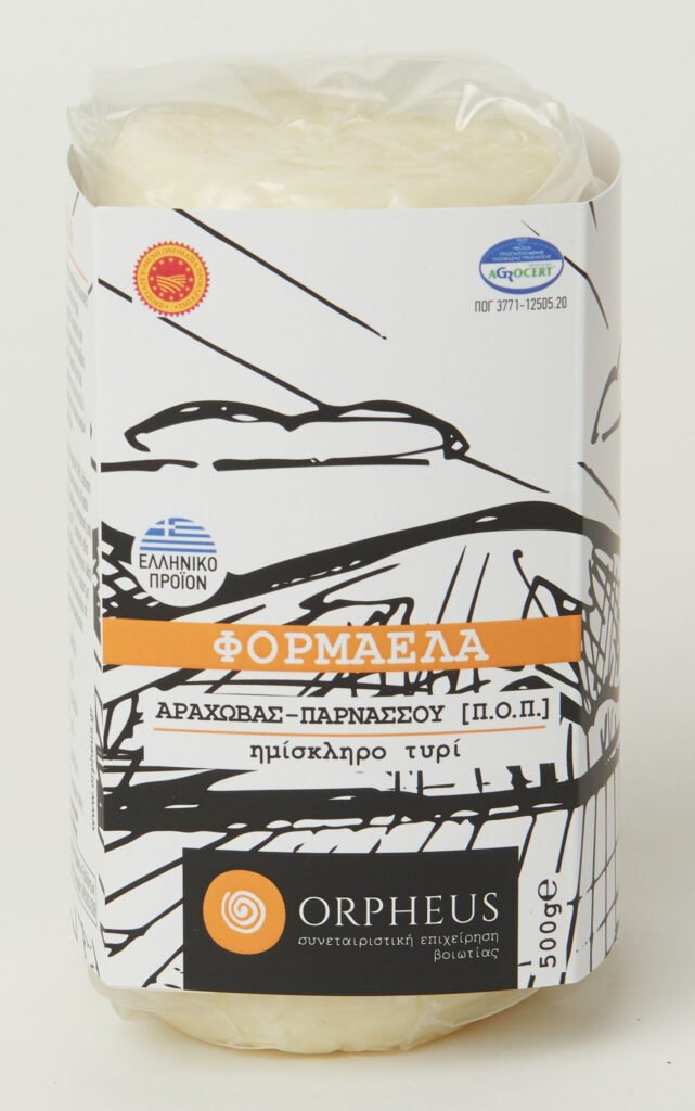 Formaela is cylindrical, weighing approximately 500 grams per wheel. It develops a delicate yellow rind with aging, while the interior remains elastic, compact, and pale yellow with no holes. It contains a maximum of 50% moisture and a minimum of 40% fat content (dry matter), with an average salt concentration of 2.5%.